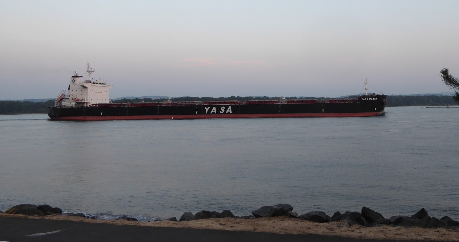 We sat out until it started to get cool, then went in to play cards. As I was sitting facing the front of the RV, I suddenly looked up and saw a huge ship in the windshield! That stopped the card game! It was the biggest one we had seen yet! You can see the blue of the windshield in the top of the first photo, so I stepped outside to get a better picture. On the back it said "Majuro" which I looked up.